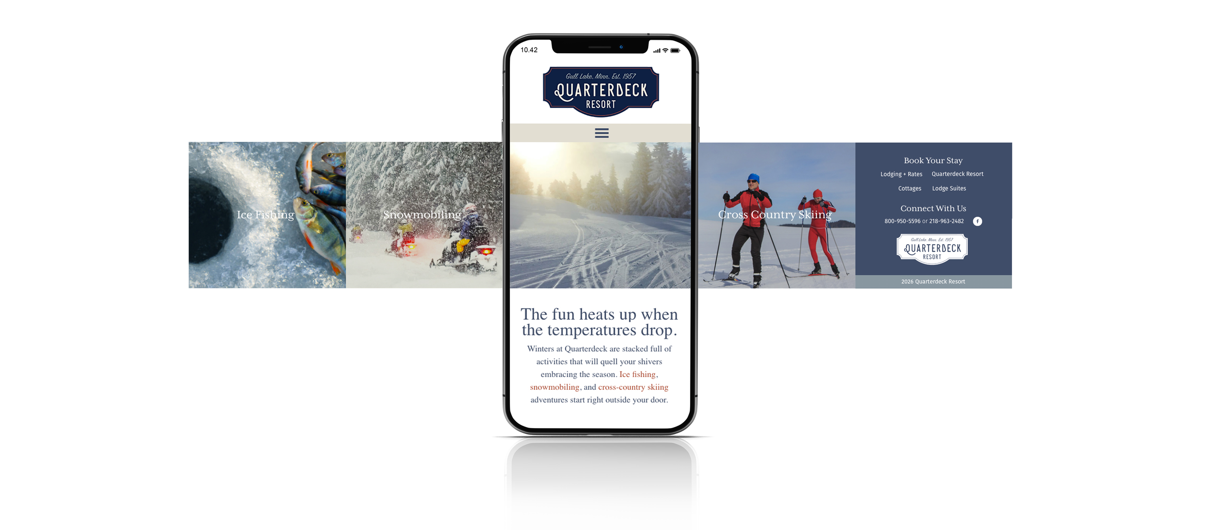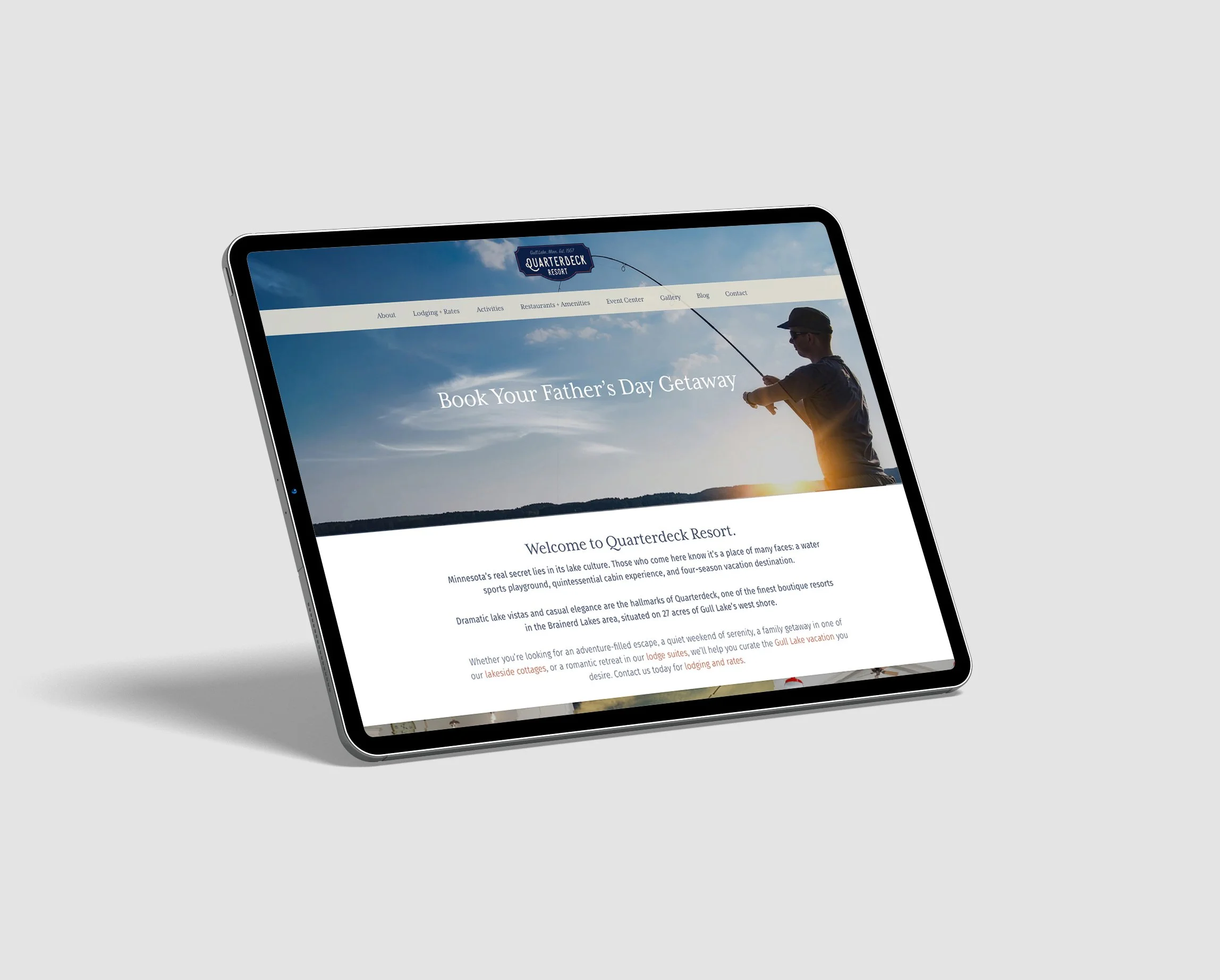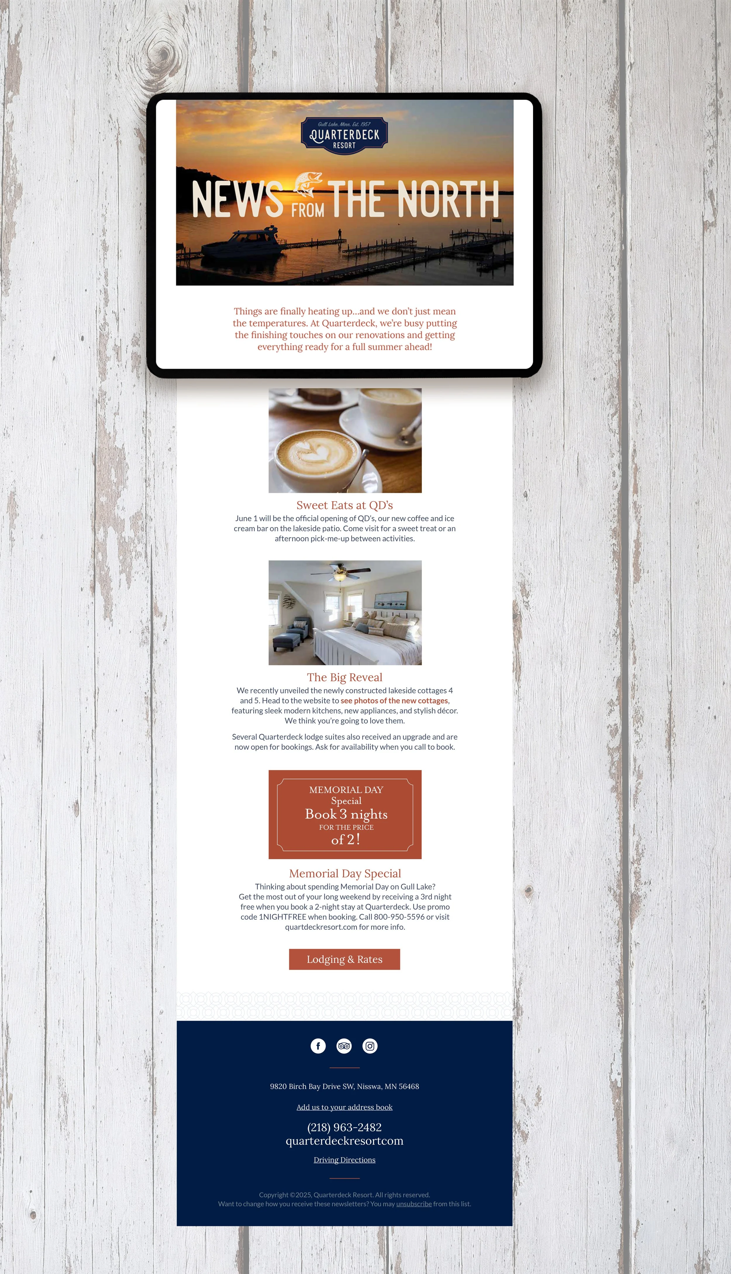 The Quarterdeck Resort identity blends nostalgia and relaxation, with a logo inspired by a vintage 1950s boat emblem. Soft tones and classic nautical elements, combined with a clean, structured layout, make trip planning effortless.
